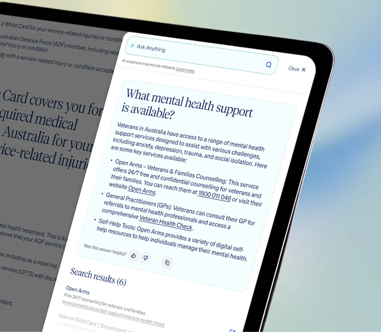 Think of it as AI Overviews, built entirely on your organisation's content. When citizens, patients, students or customers ask a question, Wizen surfaces a clear, direct answer drawn from your approved knowledge base. Not the open web. Not a guess.